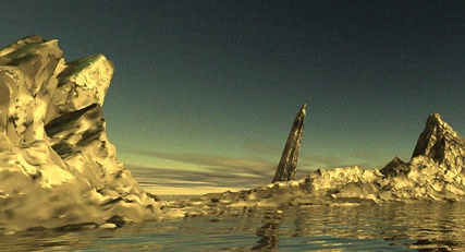 The view above is taken from a three dimensional computer generated model representing ionisation energies of the elements, and 'looks' north-eastward across the transition metals with the alkali & alkaline earth metals to the left and the pillar of hydrogen in the centre distance. Each model features at least four views, an animation sequence and supporting interpretative material. |